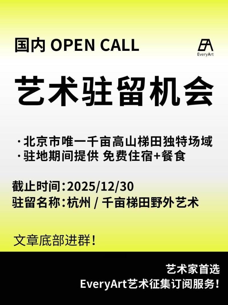 9.17🌾千亩梯田野外艺术·FEEL@镇罗营|第一期开启!📍地点:北京·平谷·镇罗营千亩梯田⏰驻地时间:2025年9月–2026年1月(建议3–6周)📮申请截止:即日起开放,扫码提交资料在北京城边,竟然藏着一片宛如南方山里的千亩高山梯田🌿。春有梨花,夏看葵海,秋收稻谷,冬藏丰景。这里不仅是农田,更是一幅自然与人共生的画卷。现在,它正式向创作者们发出邀请!✨✨驻地亮点🌍独特场域:北京市唯一千亩高山梯田,万亩果园、清泉长流、环山步道,四季皆是艺术灵感源泉。🏡免费食宿:驻地期间提供免费住宿+餐食,环境天然、社区氛围浓厚。🌱社区共建:通过艺术激活乡村,结合在地非遗、果业、手工艺,推动灾后重建与生态家园共建。🎨创作自由:可在梯田景观点位、乡村空间进行野外艺术创作(装置、影像、绘本、音乐、写作、策展、运营等均可)。🍊特别回报:「果实换果实」机制给你一棵果树的命名权获得这棵果树一年的全部收成你的作品与这片土地紧密相连,留下独特印记。🎯适合谁申请?艺术家:装置、影像、音乐、绘本、舞蹈、写作…策划人:展览、活动、研学…行动者:咖啡馆、社区运营、生态创业…学者/程序员/设计师/摄影师…👉只要你愿意与乡村共创、与土地对话,都欢迎加入。🗓️项目机制报名材料:个人简介&作品集驻地时间选择(3–6周)驻地方案(场景偏好/预期目标/所需帮助)入选艺术家:需自理交通;创作材料如需补贴需提前沟通;作品署名权归创作者,所有权归主办方。成功完成驻地任务→获得「新村名荣誉」+果树命名权+果树一年收成。📞咨询方式策展理念:泊行驻地工作:吉木驻地条件:铁铮📍镇罗营梯田,不只是一个驻地,而是一次艺术×乡村×共建的温柔实验。✨在这里,你将与自然、与人、与自己重新建立深度联结。扫p2码提交申请,带着你的创意,一起让这片土地焕发新的可能!