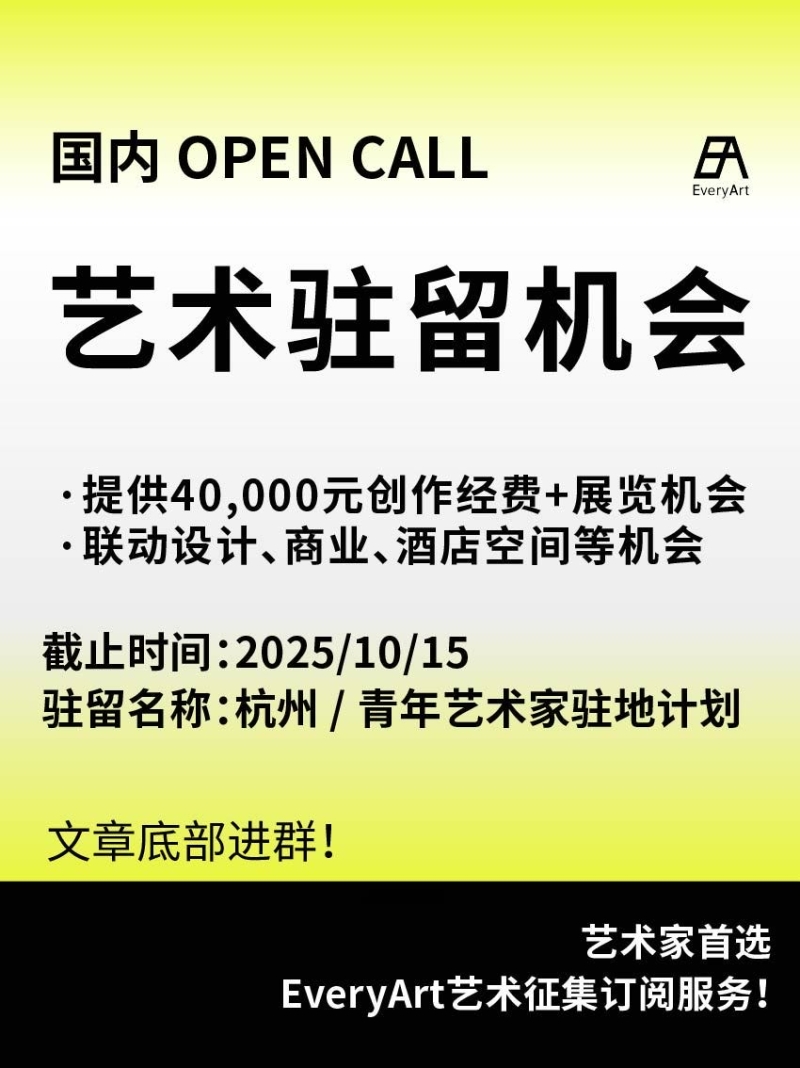9.17🐎展望·青年艺术家驻地计划2026|马年第三届📍地点:杭州·西湖龙酒店&SGallery⏰申请截止:2025年10月15日中午12:00如果你是一位正在突破自我的青年艺术家,这里就是你实现创作与展示梦想的舞台!✨🔥项目亮点🏡驻地环境:杭州西湖畔,艺术氛围浓厚,融合自然与人文的独特场域。💰创作支持:主办方为每位入选艺术家提供¥40,000创作经费+创作场地、展览空间。🎨多元艺术门类:视觉艺术、跨界艺术、音乐、装置、雕塑、设计、影像、舞蹈等均可申请。🌍展览机会:青年艺术家群展年末评选“青年艺术奖”获奖艺术家将受邀进行更大规模展出计划国内巡展,甚至走向海外(巴黎、巴塞尔等艺术现场)🤝跨界合作:联动设计、商业、酒店空间,探索艺术跨界的更多可能性。🗓️项目流程申请时间:2025年9月15日12:00–10月15日12:00首批入选名单公布:2025年10月20日创作时间:2025年10月28日–11月28日青年艺术家公共开放展:2025年12月23日–2026年2月28日艺术奖评选及颁奖:2026年3月1日–4月15日国内巡展启动:2026年4月–8月🎯招募对象年龄18–45岁青年艺术家(1981年后出生)欢迎各类视觉艺术、跨界艺术、音乐、影像、舞蹈、设计等领域创作者有突破创作边界与深度探索的热情📩如何申请需提交:个人简介及艺术创作简历近期创作作品图集项目创作提案说明作品预算明细👉发送至邮箱:prlifestyle@dragon-hotel.com