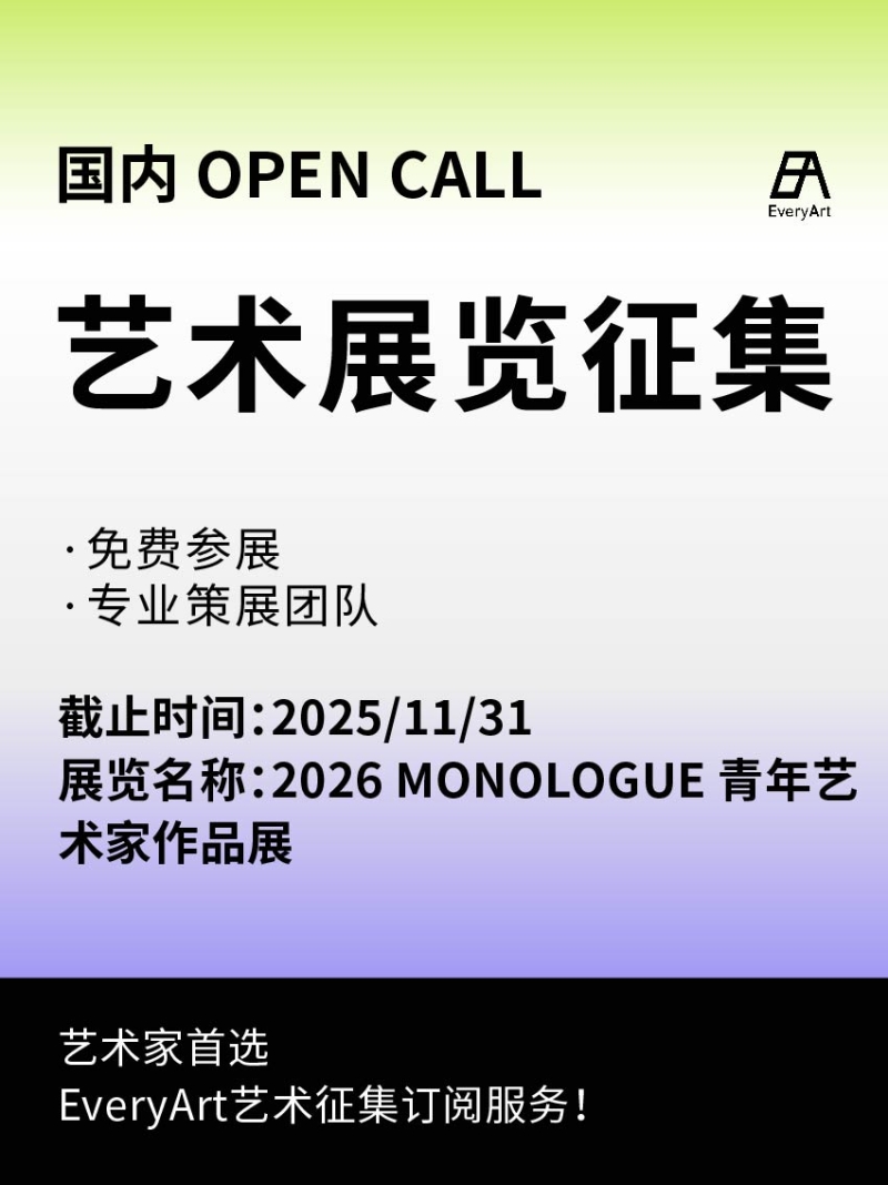 为推动中国青年艺术家的发展,促进美学美育的普及,独白美术馆提供了一个开放包容的平台,使无数宝贵的灵感碰撞,优秀的创作交流。现将此次展览有关事宜通知如下:◾️组织机构秦皇岛独白美术馆◾️展览日期2026年(待定)◾️展览地点河北省秦皇岛市蔚蓝海岸·独白美术馆◾️征集办法本次展览作品在全球范围内公开征集。◾️参展要求(一)作品内容绘画、雕塑、设计、影像、行为/表演艺术、互动项目、策展项目等,不限形式与媒介,MONOLOGUE鼓励所有“非常规”的创意!(二)投稿要求投稿作品必须为原创作品(投稿时需进行原创声明,如因此产生任何纠纷,相关责任由创作者自行承担)。(三)作品命名作品命名要求格式:投稿人姓名+院校+作品类别+作品名称。(四)作品提交作品提交需包含作品简介(200字以内,包含作品尺寸、需要展览空间、展览形式)、艺术家简介(100字以内,包含院校、专业、年级及联系方式)、作品图片/视频、联系方式。◾️评选(一)作品征集截止时间2025年11月31日。请投稿的艺术家注意提交时间。(二)入围结果入围情况将于2025年12月31日前揭晓。(三)投稿方式以邮件投稿,投稿收件邮箱:qhddubaiart@163.com欢迎将中文版作品集同步至EveryArt官方邮箱:everyart@163.com获得更多合作机会。