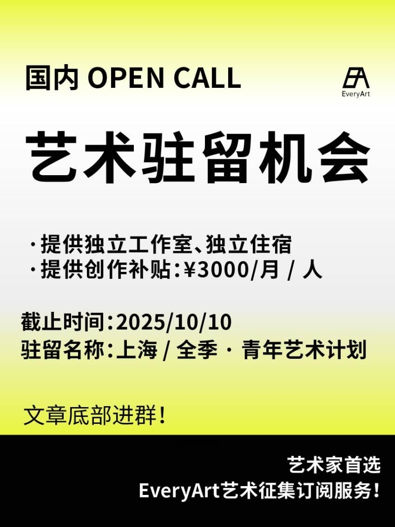 2025-09-17 临期|征集资讯 #国内艺术驻留 #艺术驻留 1 评论 43 喜欢 分享 白雪松 自我介绍一下吧~ 查看TA的全部内容 +关注 EveryArt 去发现更多有趣内容 微信扫码打开EveryArt小程序 体验更多「EveryArt」新功能 评论 1 Naya 2025-09-22 118 怎么报名 我也来讲两句