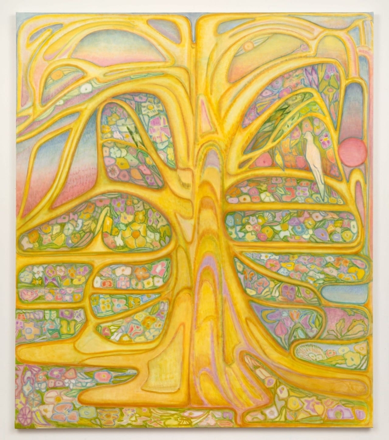 本展是 Laurie Nye 在 Philip Martin Gallery 的第三次个展,展示她的新作系列。 在这些画作中,自然世界成为她表达情绪、记忆、存在感的媒介。她特别关注“敬畏”(awe)这一力量:对天空、细微自然、未知境界的敬畏感,是驱动她创作的重要动因。 Laurie Nye 的作品强调画布的物质感、平面性与构图结构,她通过线条、色块、重叠与留白,让画面既有视觉张力,也保持内在的静谧。 她从个人经历、自然景致与记忆出发,运用反复的图案、象征与色彩变化,呼应人与自然的内在联系。