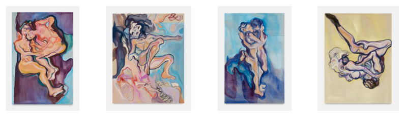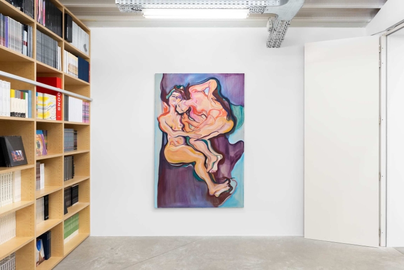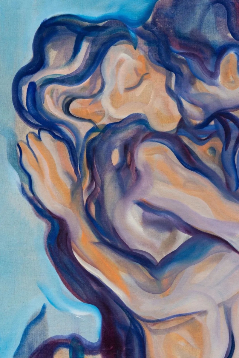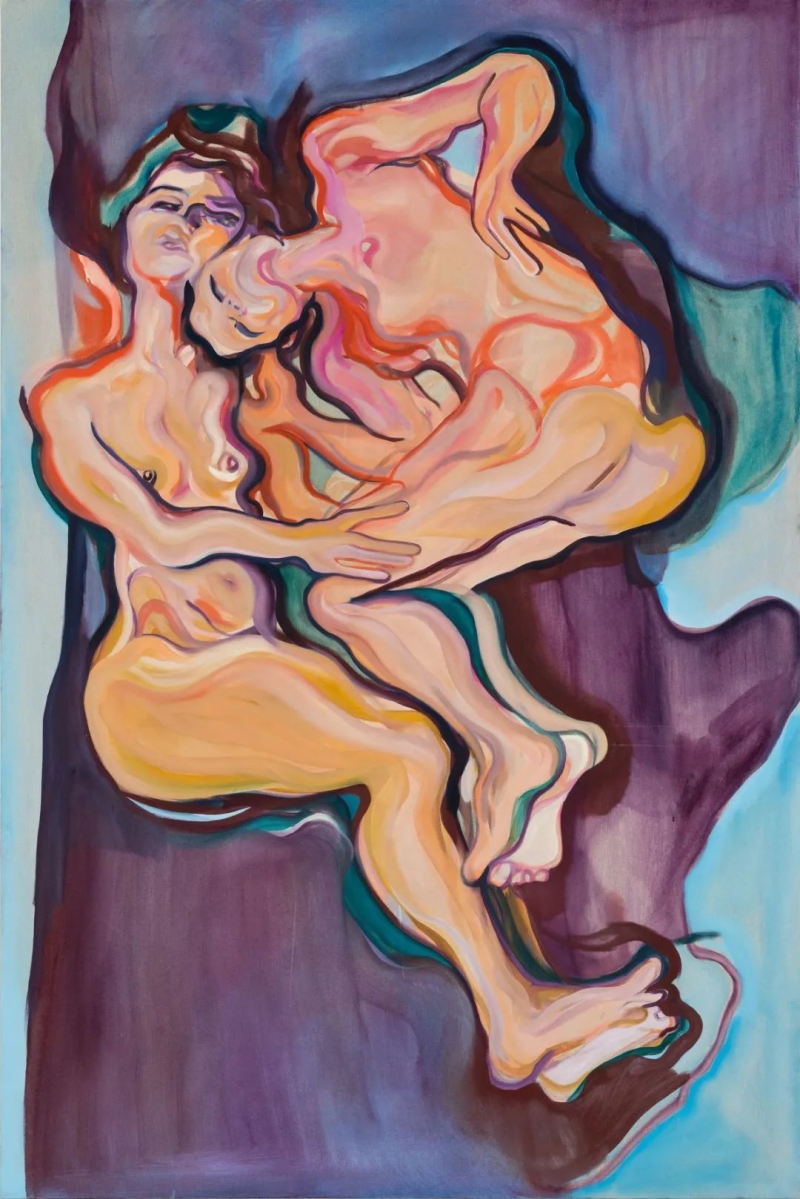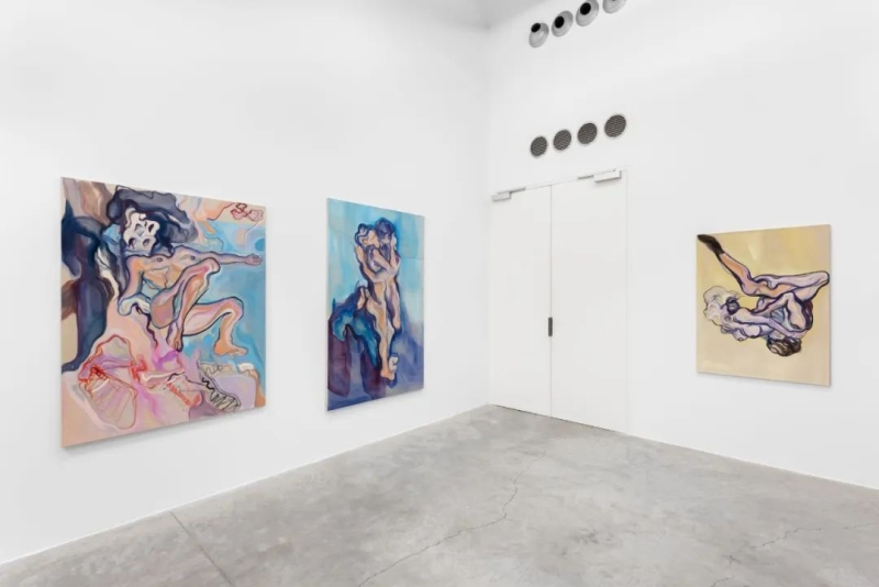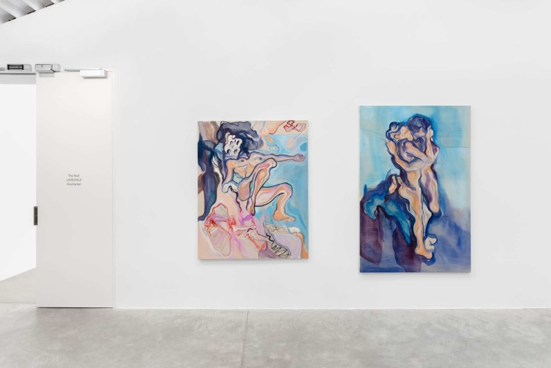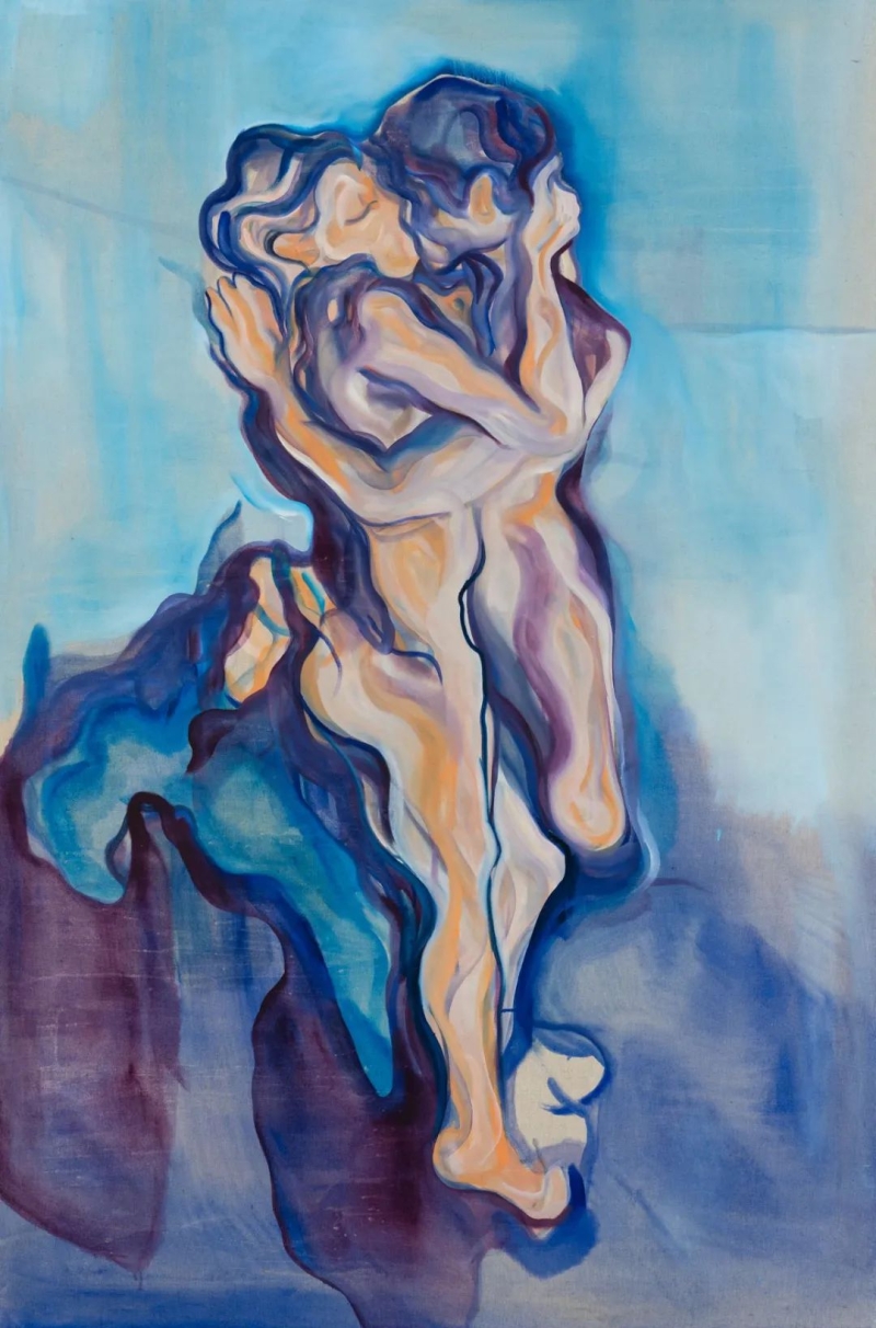 ◾关于展览: 安娜·卡卡尔是一位法裔美国艺术家,在巴黎生活和工作多年。观众将在阿尔敏·莱希 - 布鲁塞尔的展览「墙壁:爱子」中体验专属于她的私密世界,她在展中向生父爱德华·卡卡尔(Edward Karkar)致敬。此次展中精选的新作品带我们踏上了一段穿越色彩和象征寓意的旅程。卡卡引于自身创作引用了维也纳分离派(Vienna Secession)的重要作品。其笔下的裸体绘画中,描绘的身体经常是形态扭曲并融合成一种怪诞恐怖的舞蹈中,让人联想到埃贡·席勒(Egon Schiele)的作品,或者是借由奔放激情的结合,让人想起古斯塔夫·克里姆特(Gustav Klimt)的经典作品《吻》。艺术家对于绘画过程中手势的精通掌握,体现在她横跨抽象与具象、人与人形混合体之间的探索。其作品讲究的是色彩关系,其融合着蓝色的明亮色调让观众眼前为之一亮。卡卡尔作品中的明暗对比手法,也让人想起充满氛围电影场景;她的创作受到集结于集体潜意识中图像的影响,尤其是实验恐怖电影,正如其借鉴电影名称的作品,如《双子的天空》(Twin Falls,1999年的美国电影,讲述一对连体双生兄弟的生活被一个女孩闯入并打乱)以及《绑定》(美国电影Skin in the Game (2019),根据真实故事改编,讲述一位母亲从人贩子手中营救被拐女儿)所表达呈现的。艺术家巧妙地将这些氛围感的电影元素与自身艺术语言相结合,打造出充满迷人魅力的视觉对话。