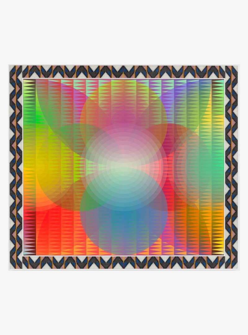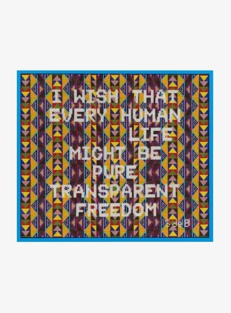 ◾️关于展览: Hauser & Wirth 巴黎空间推出 Jeffrey Gibson 的个展 THIS IS DEDICATED TO THE ONE I LOVE,呈现其最新的绘画、纺织、雕塑与文本作品。展览标题取自 1967 年 The Mamas & the Papas 的同名歌曲,也是一首写给集体的情书。 展览延续了 Gibson 一贯的跨文化视觉语言——几何构图、手工珠饰、刺绣、染布、标语与政治诗学共存。作品在色彩与文字之间穿梭,将原住民符号学、酷儿美学与美国流行视觉语汇重组为一种“庆典的政治”。 在巴黎展厅中,墙面上悬挂的纺织旗帜与画布以鲜明的霓虹色调闪耀,印有短语如 “LOVE IS A VERB”、“PROTECT THE SACRED”、“WE ARE THE ONES WE’VE BEEN WAITING FOR”。这些语言像祷文,也像口号,让空间成为介于抗议与仪式之间的场所。 Gibson 的艺术在此成为一种邀请:去爱、去聆听、去记起——那份属于共同体的温柔力量。