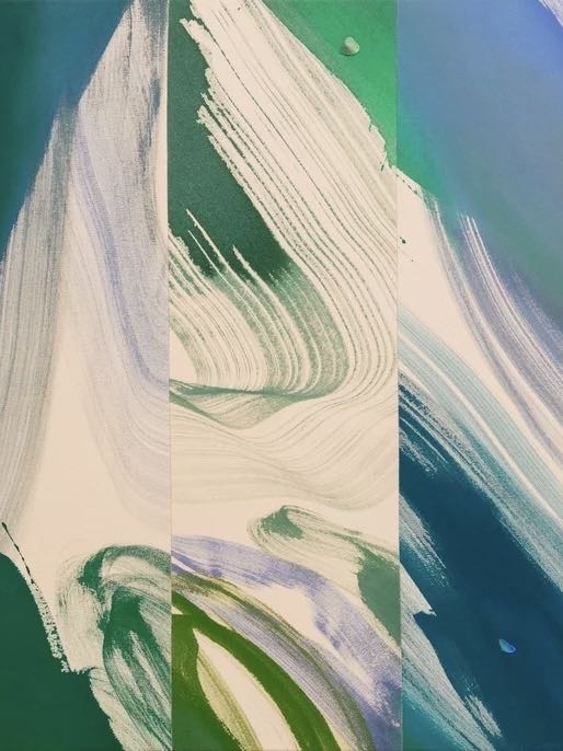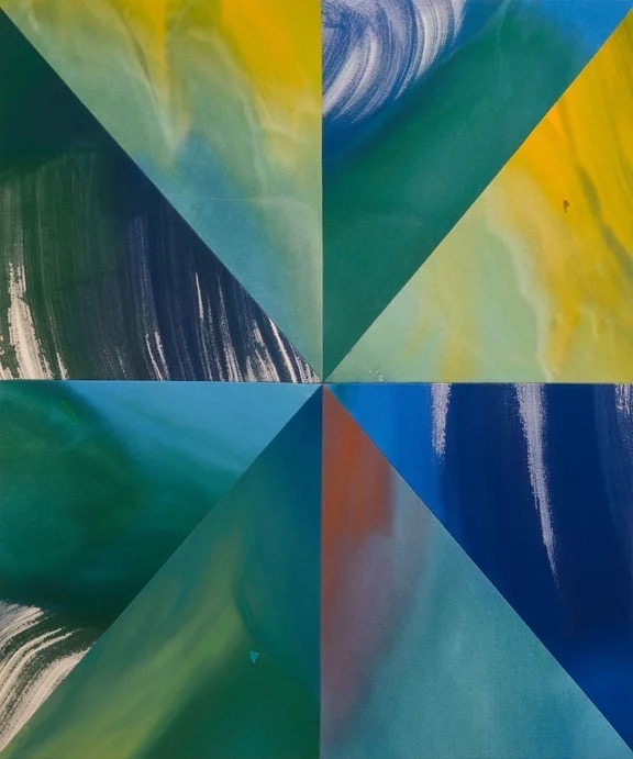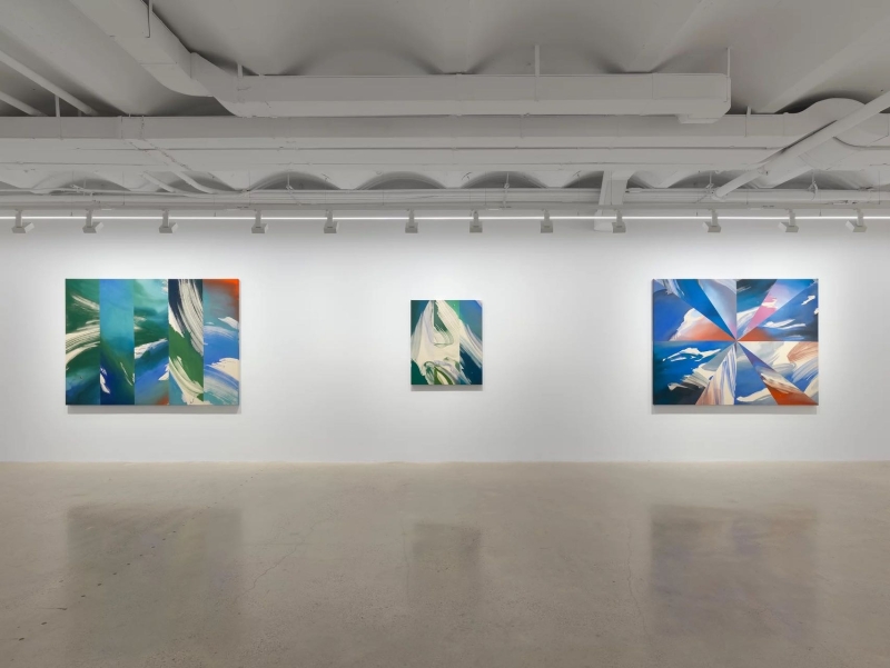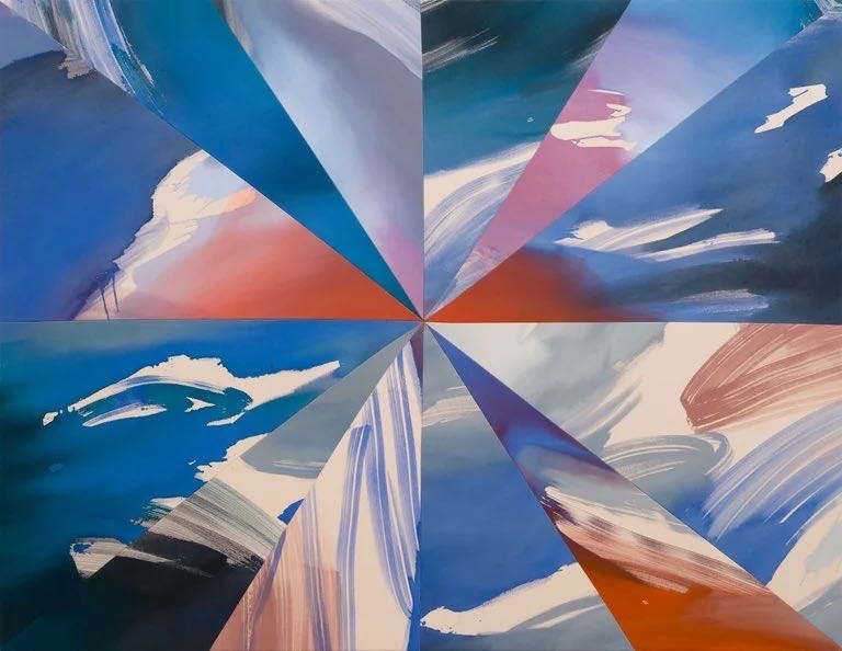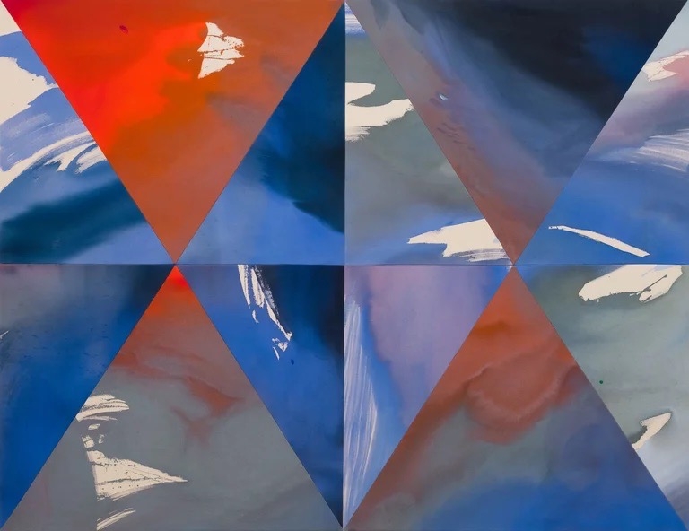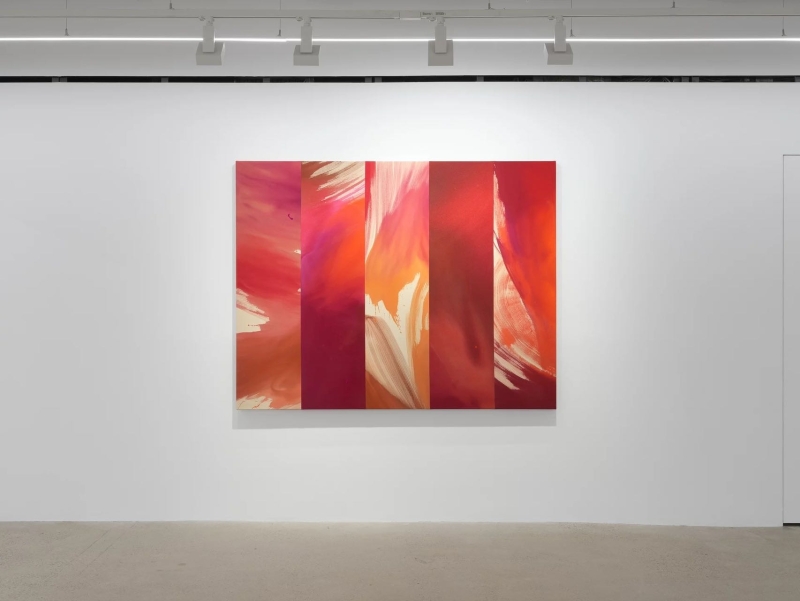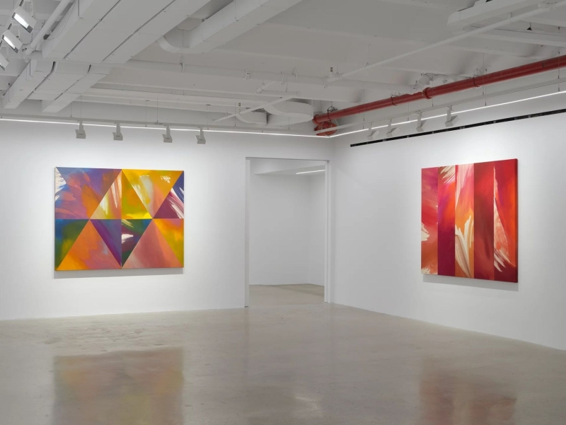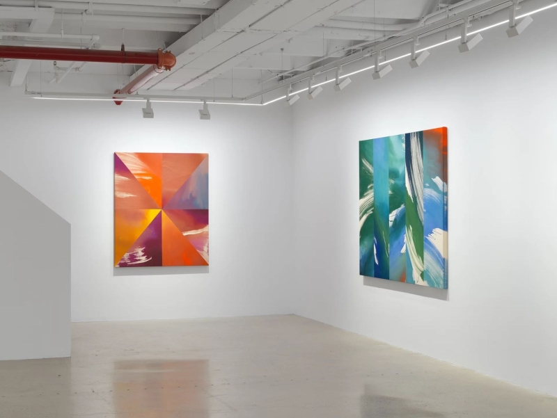 ◾️关于展览: 本次展览题为 Hourglass(沙漏),Heather Day 的第二次与 Almine Rech 画廊合作。 展览简介指出:她的绘画“是时间的索引(indexes of time)”,这些看似静态的画布其实容纳了“短暂的运动与手势、生成与熵、混沌与控制”。 她居住于美国莫哈维沙漠,其画面色彩常取自日出日落的天空、岩石、植物在干燥空气中蒸发、光影交错的瞬间。 本展中,“沙漏”被作为关键意象——Day 以沙漏象征“时间的流动性”,并在画布的几何分割与色彩流动中让“重力”“顺序”“裂变”并置。 观者在展览中不仅“看色彩”,也“感知时间”:画布如钟摆,在刚生成的色斑与流淌的颜料之间回响。