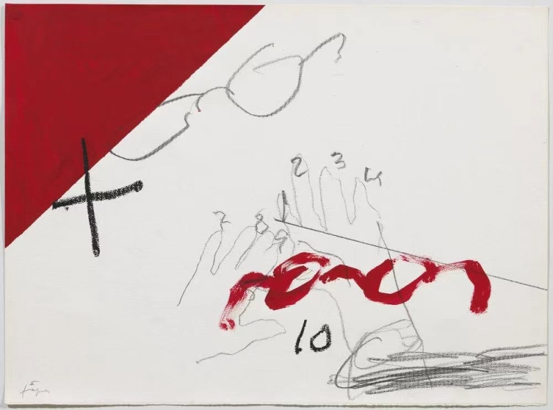 ◾️关于艺术家: Antoni Tàpies(1923–2012)是欧洲战后最重要的抽象/物质主义艺术家之一。他以混合媒材、粗糙肌理与符号化痕迹著称,强调物料的质感与“时间、身体、伤痕”的痕迹感。 在“On paper”系列中,他转而使用纸张这一更为脆弱、即时、敏感的媒介,他的素描、拼贴和水性作品保留手势与材料的原始张力,呈现其对存在、记忆、物质与精神之间关系的持续追问。