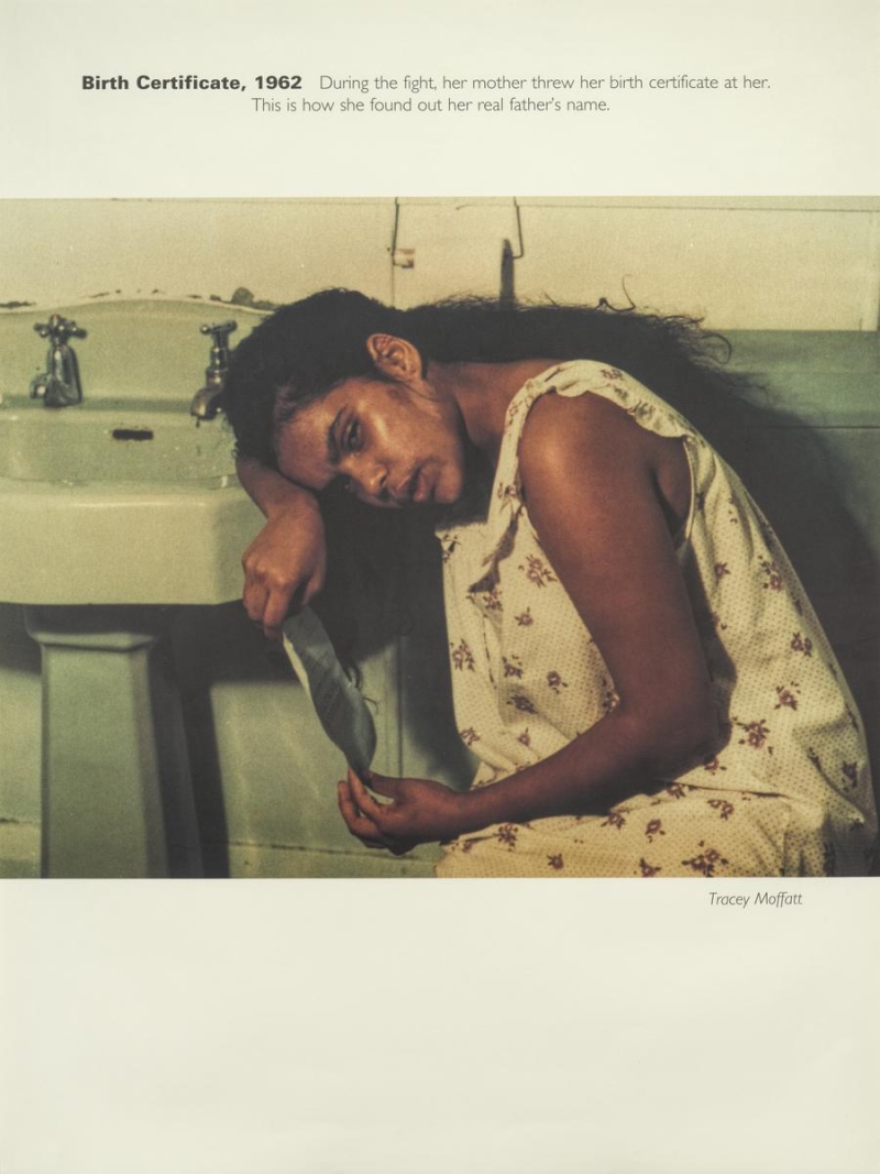 进入 1990 年代后,Moffatt 的创作转向更具社会批判性的叙事路径。摄影系列《Scarred for Life》(1994)与《Up in the Sky》(1998)借鉴新闻影像与电影蒙太奇的语言,触及“被偷走的一代”等澳大利亚原住民历史议题。她曾表示,自己的叙事“有故事线,却拒绝传统的起承转合”。Moffatt 的艺术实践始终游走于影像、叙事与政治之间。她通过精心构建的视觉语言,使影像成为一种批判性的工具——既揭示历史,也迫使观者重新审视“观看”本身所隐含的权力结构。