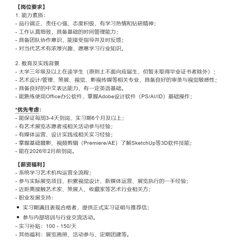 2026-01-14 国内|艺术招聘 #艺术招聘 #上海 #上海招聘 0 评论 41 喜欢 分享 GaoGao 自我介绍一下吧~ 查看TA的全部内容 +关注 EveryArt 去发现更多有趣内容 微信扫码打开EveryArt小程序 体验更多「EveryArt」新功能 评论 0 我也来讲两句