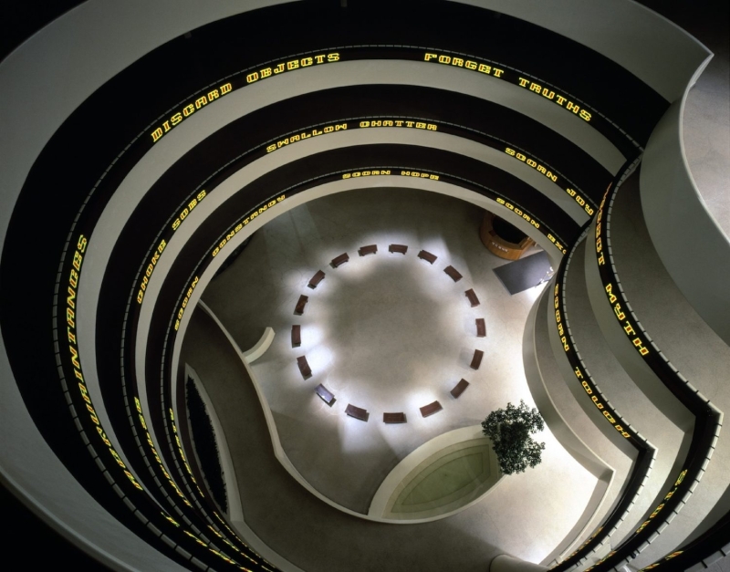在国际艺术界,Holzer 的影响力逐渐扩大。1990 年,她代表美国参加 威尼斯双年展(Venice Biennale),并凭借装置作品 《Mother and Child》 获得金狮奖,成为历史上少数获得这一荣誉的女性艺术家之一。她将展馆空间转化为充满文字与光线的环境,使观众沉浸在不断流动的信息之中,从而强化语言在政治与社会结构中的力量。
