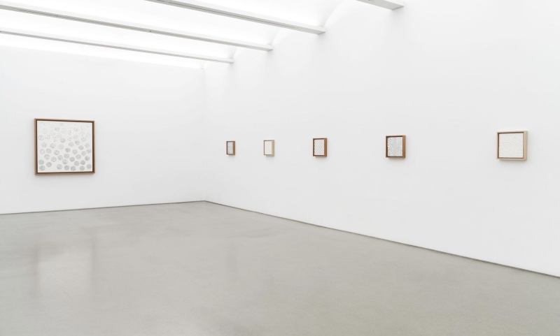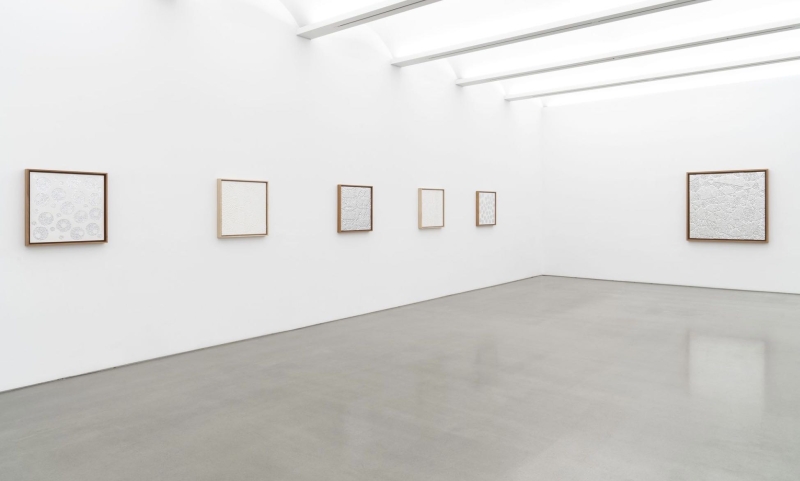 ◾️ 关于艺术家: Gabriel de la Mora(1968 年生于墨西哥城) 的创作常以拾得物与日常材料为起点,例如蛋壳、人类头发、鸟羽、鞋底、显微镜玻璃片等。他通过收集、分解与重新组合这些材料,构建出看似简约却高度复杂的视觉结构,使物质本身成为作品叙事的一部分。在本次展览中,艺术家再次回到其 2012 年开始研究的 蛋壳系列(CaCO₃),通过对数千片蛋壳碎片的筛选、排列与组合,形成几何结构或单色画面,使重复的过程成为一种近似冥想的创作方法。