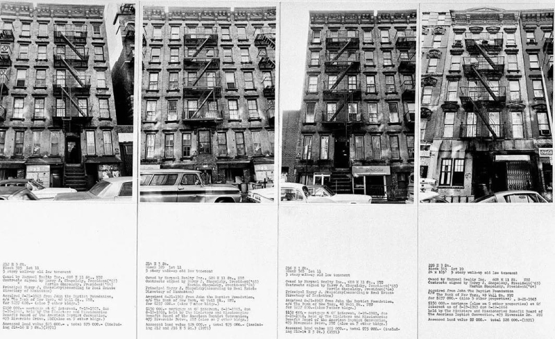 代表作:《Shapolsky et al. Manhattan Real Estate Holdings, A Real-Time Social System, as of May 1, 1971》(1971) 该作品以档案式呈现形式,系统整理了纽约房地产家族 Shapolsky 的大量房产信息,包括地址、所有权结构与交易记录。Haacke 通过图像与文本揭示其背后的资本运作与剥削机制,使原本隐藏在城市表面之下的权力结构变得可见。由于作品直接触及现实中的经济利益,该项目在古根海姆博物馆展出前被取消,引发艺术界关于审查与机构权力的广泛讨论。这一事件也使 Haacke 成为制度批判艺术的重要标志性人物。