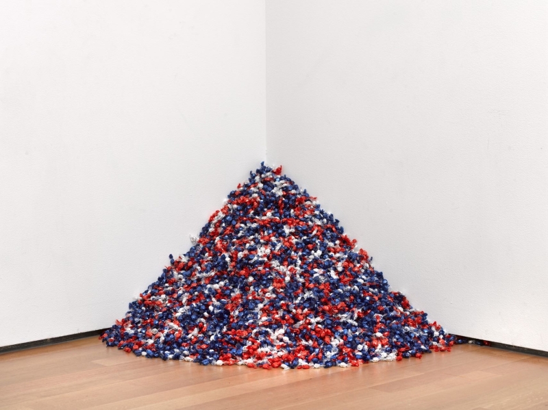 他的创作与身份政治密切相关,尤其涉及酷儿身份与艾滋病危机背景下的社会现实。他通过极为克制的方式表达个人与集体的悲伤,将私人情感转化为公共经验,从而在艺术中建立一种既温柔又具有政治力量的表达路径。他的作品既具有纪念性,也具有参与性,使观众在体验中面对“他者”的存在与消失。《Untitled (Portrait of Ross in L.A.)》(1991)是其最具代表性的作品之一。作品由一堆总重量约为175磅的糖果组成,对应其伴侣生前的体重。观众可以自由取走糖果,作品因此不断减少。通过这一简单的行为结构,Gonzalez-Torres 将“消失”转化为可感知的过程,使观众在参与中直面时间、疾病与失去,同时也赋予作品一种温柔而深刻的纪念意义。