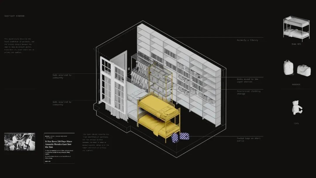 艺术家陈滢潇,本科毕业于清华大学建筑系,研究生毕业于美国纽约库伯联盟建筑学院,作品曾在2021 A World of Many Worlds 纽约,第17届威尼斯双年展展出。艺术家主题涉及身体、叙事、空间和政治,作品形式包括多媒体数字、研究记录、空间和影像。尝试从建筑学的视角,以身体作为媒介,探索身体感知和空间叙事。在作品 undocumented 系列中,艺术家用蒙太奇的拼接形式向观众详细的记录和展示一些不合逻辑、常理的空间组合,艺术家探讨了“在纽约无法被合法记录的移民的生存状态。身体本身在这里作为一个敏感的对象,暴露身体的特征和信息可能会将他们置于危险之下。所以在这个作品中,身体从世界中蒸发,用轴测图的抽象视角记录下了与身体相关的空间和物件。”