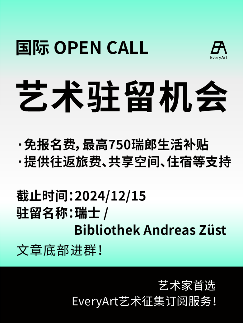 艺术驻留|Bibliothek Andreas Züst Bibliothek Andreas Züst现面向二人组和最多五人组成的团体,提供2025年夏季工作室驻留奖学金。驻留期为六周。该奖学金向国内外文化工作者开放,涵盖多个学科领域——包括视觉艺术、文学、新媒体、音乐、戏剧、设计、建筑、电影、摄影以及与艺术相关的领域。 奖学金获得者将住在阿尔彭霍夫全景旅馆(Alpenhof panorama lodge)。申请者需提交一份陈述,阐明其具体兴趣并描述申请驻留的动机。安德烈亚斯·祖斯图书馆特别欢迎与图书馆整体或其子领域相关的项目。该工作室驻留奖学金项目延续了图书馆作为知识场所的传统,强调多样性。因此,驻留期的研究应关注构成我们文化的元素以及超越这些元素的内容。