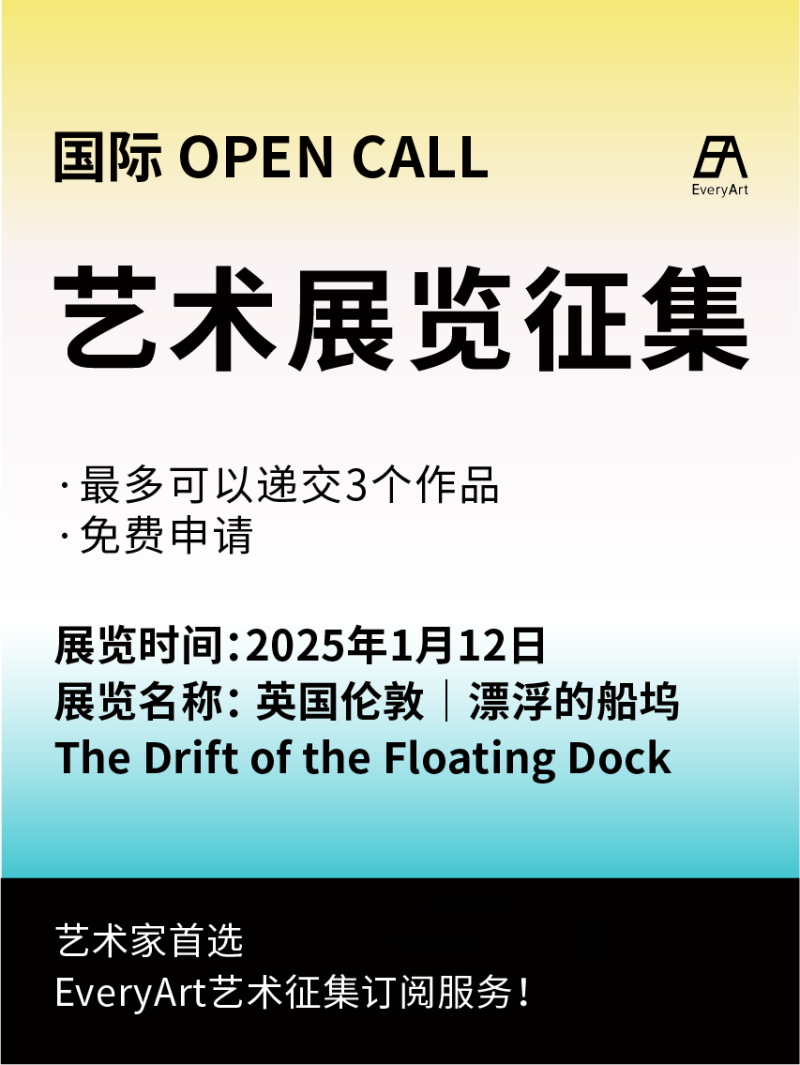 展览主题:The Drift of the Floating Dock 开放征集截止日期:2025年1月12日 展览时间:2025年1月底,展期一个月 展览地点:Simmos Coffee, 5 Skippers Yard, Fish Island, London E3 2RF 无需投递费及参展费,艺术家需自行负责运输与保险。