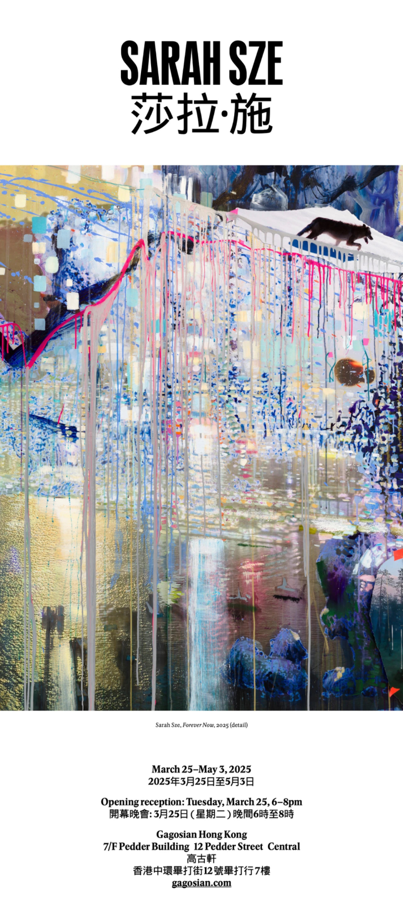 Sarah Sze(莎拉·施),1969年出生于波士顿,现于纽约定居和工作。她的作品获多间艺术机构收藏,包括:香港M+博物馆、巴黎卡地亚当代艺术基金会、伦敦泰特现代艺术馆、芝加哥当代美术馆、旧金山现代艺术博物馆、匹兹堡卡内基美术馆、纽约现代艺术博物馆、纽约所罗门·R·古根海姆美术馆、纽约惠特尼美国艺术博物馆及纽约大都会艺术博物馆等。 她曾于各地的机构举办作品展,包括:「Triple Point」, 第55届威尼斯双年展美国馆(2013)、巡展至纽约布朗克斯美术馆(2014);「Centrifuge」,慕尼黑艺术之家(2017-2018); 「Night into Day」, 巴黎卡地亚当代艺术基金会(2020-2021); 「Timelapse」, 纽约所罗门·R·古根海姆美术馆(2023)以及达拉斯纳西尔雕塑中心(2024)。 她获委托创作的永久展出作品包括:位于纽约拉瓜地亚机场的《Shorter than the Day》(比白天还短暂,2020);位于新奥尔良艺术博物馆拜绍夫伉俪雕塑园的《Fallen Sky》(天崩,2024)。