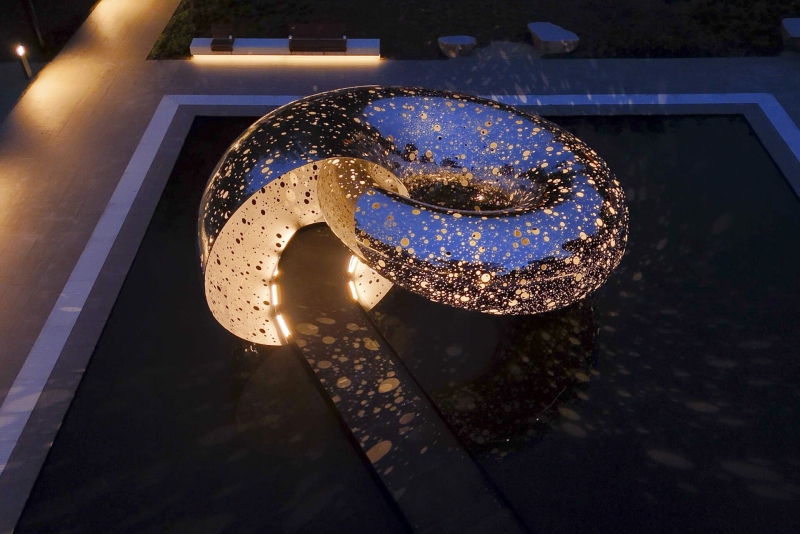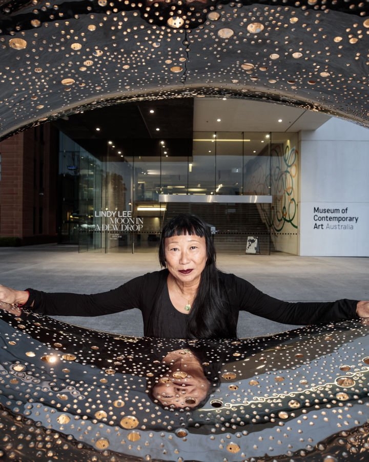 Lindy Lee 是一位拥有超过四十年创作实践经验的澳大利亚艺术家,她始终从自己的中国血统中汲取灵感,将道家和禅宗的哲学思想交织在一起,将人类和自然视为一体。她的最新作品《Ouroboros》是为澳大利亚国立美术馆四十周年庆典特别定制的沉浸式雕塑。该雕塑宽达九米,高逾四米,邀请观众观看并沉浸在她的幻象中--漫步于一个巨大的圆形空间,唤起人们对生命、死亡和重生循环的思考。 《Ouroboros》的名字来源于古代 ”蛇吞象 "的象征,它体现了永恒循环的概念,这一理念跨越文化而普遍存在。该雕塑矗立于澳大利亚国立美术馆的入口,引领访客穿过雕塑进入光与暗交汇的内部空间。雕塑表面布满了成千上万的小孔,使光线得以穿透并在空间中舞动。白天,其镜面不锈钢材质反射着周围瞬息万变的世界——人、云、鸟;夜晚,雕塑内部发出光芒,将光亮回馈给周围环境,象征着万物的连续性和相互关联性。