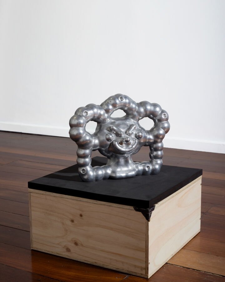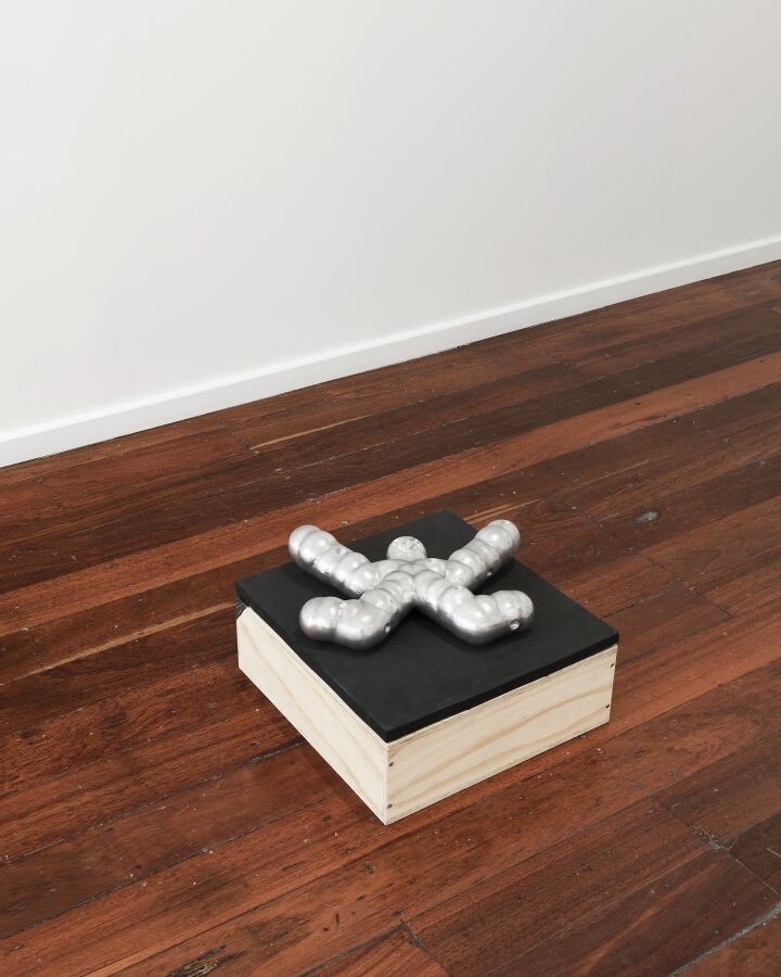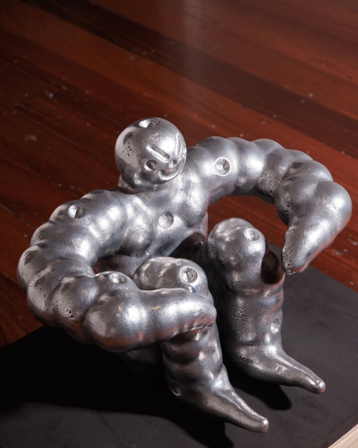 Tim Meakins是来自西澳大利亚州珀斯的一位艺术家和设计师,以跨越雕塑、绘画、版画、动画和出版等多个媒介的创作而闻名。他的作品从计算机图形、操作系统和动画片中汲取灵感,将这些元素融合在一起,探索数字与模拟现实之间不断变化的界限。米金斯通过夸张、卡通化的形象来研究人体的极限,这些作品通常以力量和体能为主题,描绘肌肉发达的人物摆出象征力量和耐力的姿势。 利用虚拟现实(VR)、3D建模和铸铝技术,艺术家创作了自己身体处于不适、过渡姿态的雕塑。这些姿态传达了泄气、压缩、皱缩和紧张的感觉——肌肉的强壮形态与潜在的脆弱性形成了鲜明对比。艺术家有健身背景,经常使用重复动作和负重练习来增强体力,因此他挑战将身体视为机器的概念。但是,他聚焦于崩溃的瞬间,质疑身体是如何被力量和弱点所定义的。