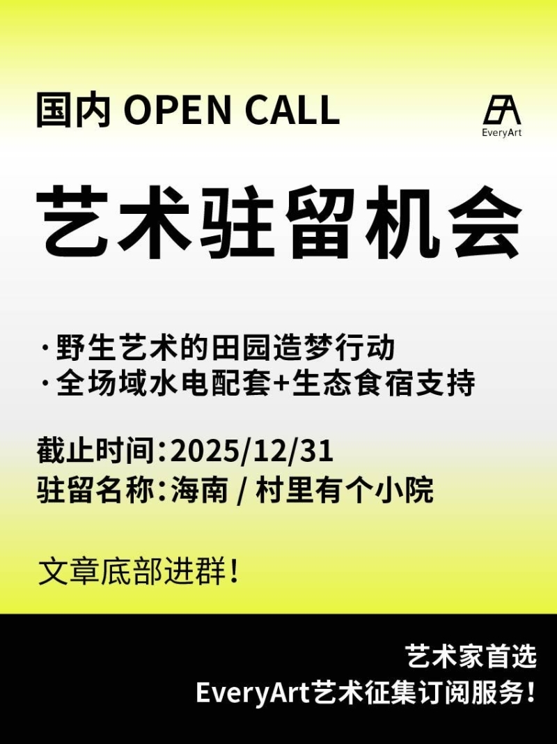 2025-06-05 全球|艺术驻留 #国内艺术驻留 #艺术驻留 0 评论 98 喜欢 分享 白雪松 自我介绍一下吧~ 查看TA的全部内容 +关注 EveryArt 去发现更多有趣内容 微信扫码打开EveryArt小程序 体验更多「EveryArt」新功能 评论 0 我也来讲两句