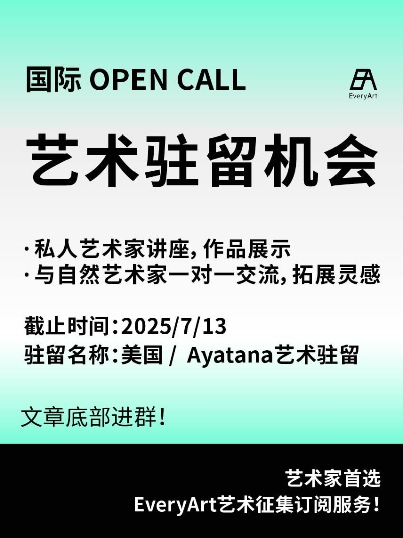 2025-07-02 临期|征集资讯 #艺术驻留 #国际艺术驻留 0 评论 78 喜欢 分享 白雪松 自我介绍一下吧~ 查看TA的全部内容 +关注 EveryArt 去发现更多有趣内容 微信扫码打开EveryArt小程序 体验更多「EveryArt」新功能 评论 0 我也来讲两句