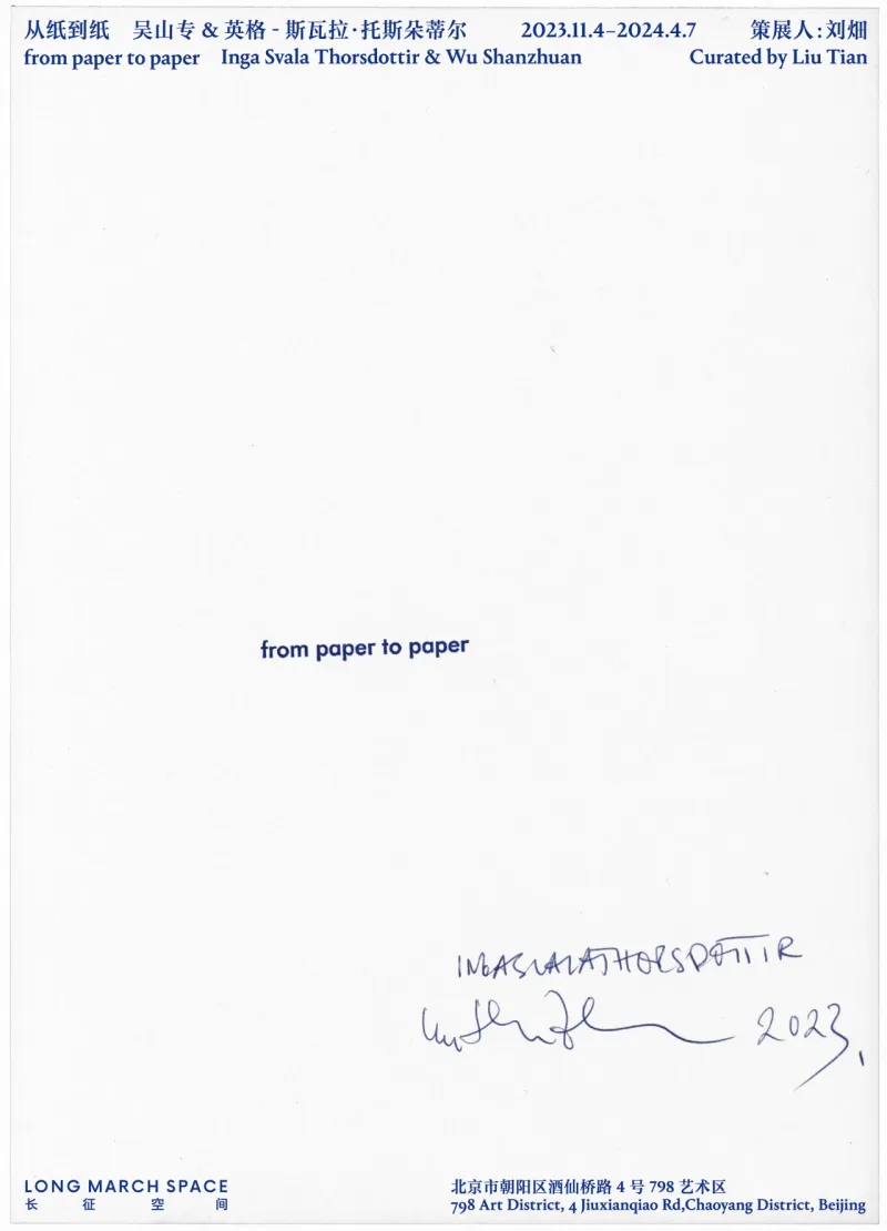 吴山专 & 英格-斯瓦拉·托斯朵蒂尔(Inga Svala Thorsdottir & Wu Shanzhuan)展览“从纸到纸 | from paper to paper”将于2023年11月4日在长征空间开幕。展览由与两位艺术家长期合作的策展人、研究者刘畑策划。