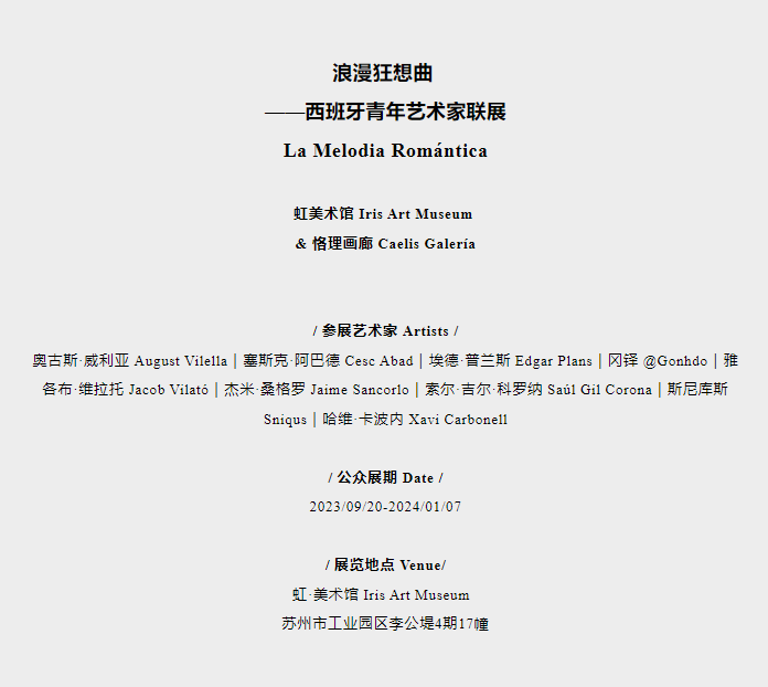◾展览信息: ◽虹·美术馆与恪理画廊特别推出「浪漫狂想曲 La Melodia Romántica——西班牙青年艺术家联展」 ◽展期:2023年9月20日-2024年1月7日 ◽艺术家:艺术家群展 ◽空间:虹·美术馆 Iris Art Museum ◽地址:苏州市工业园区李公堤4期17幢